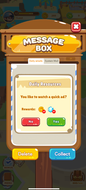 Looking at quick and easy ways to allow the user to gain in game rewards by watching ads yet allowing the user to choice when they would like to interact with said ads to not interrupt the flow
